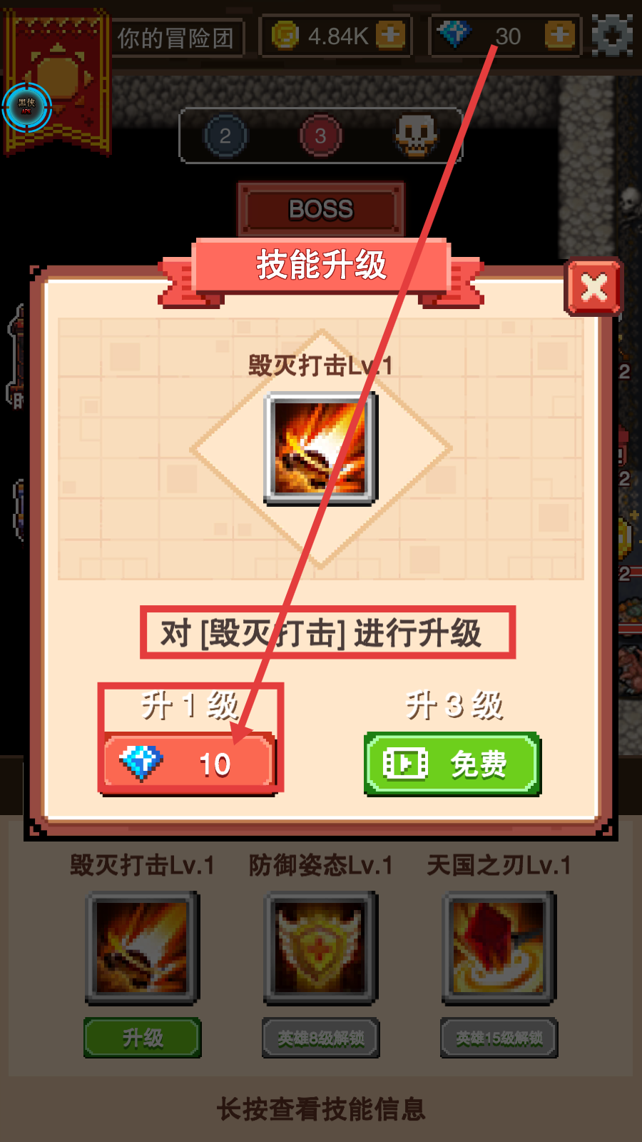 4、升级【毁灭打击】技能,可消耗【钻石-10】升1级或看广告免费升级,提升英雄战斗能力。