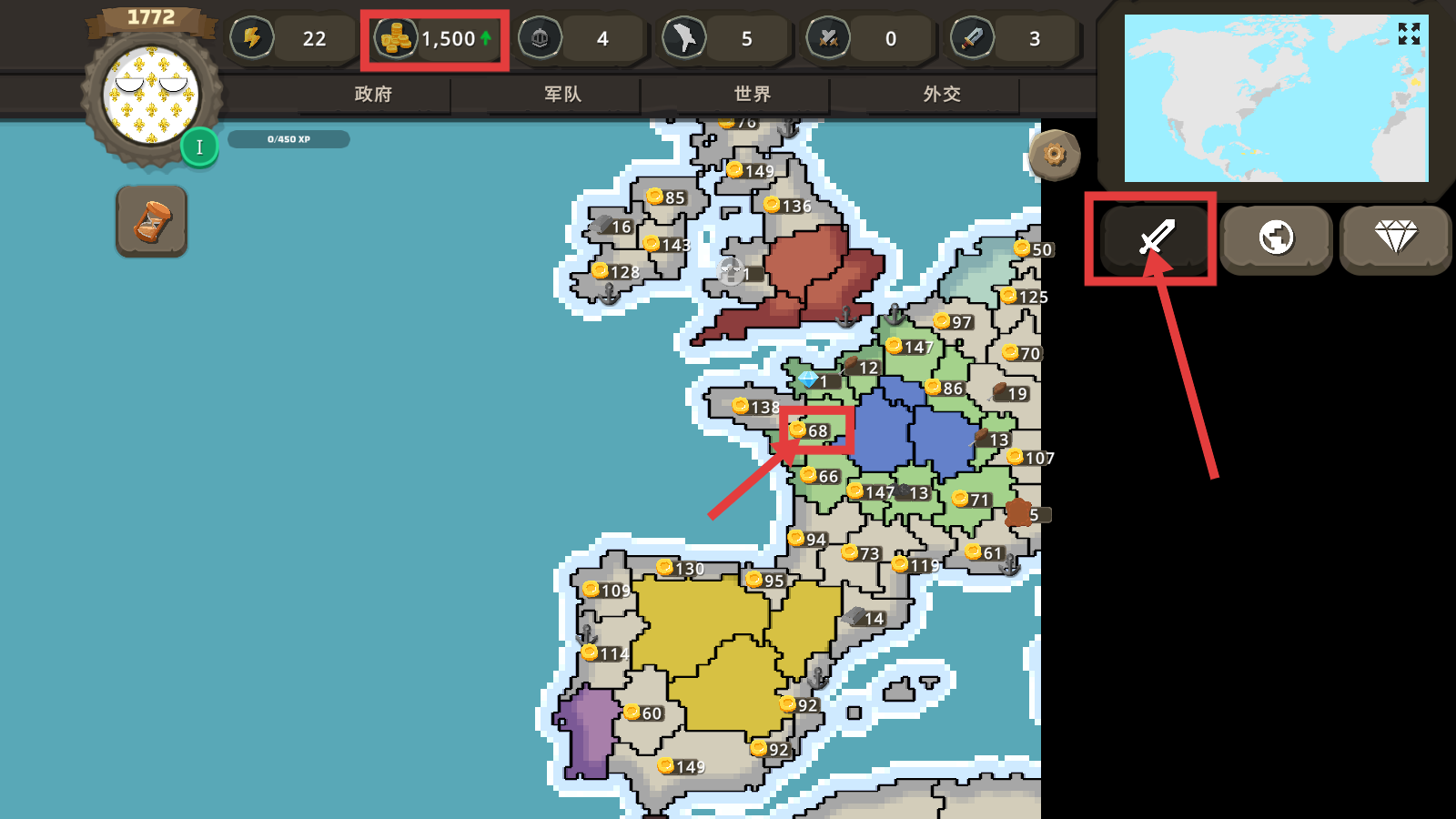 2、在地图界面,关注【金币-1,500】,点击右侧sword按钮,选择资源地区进行开发。