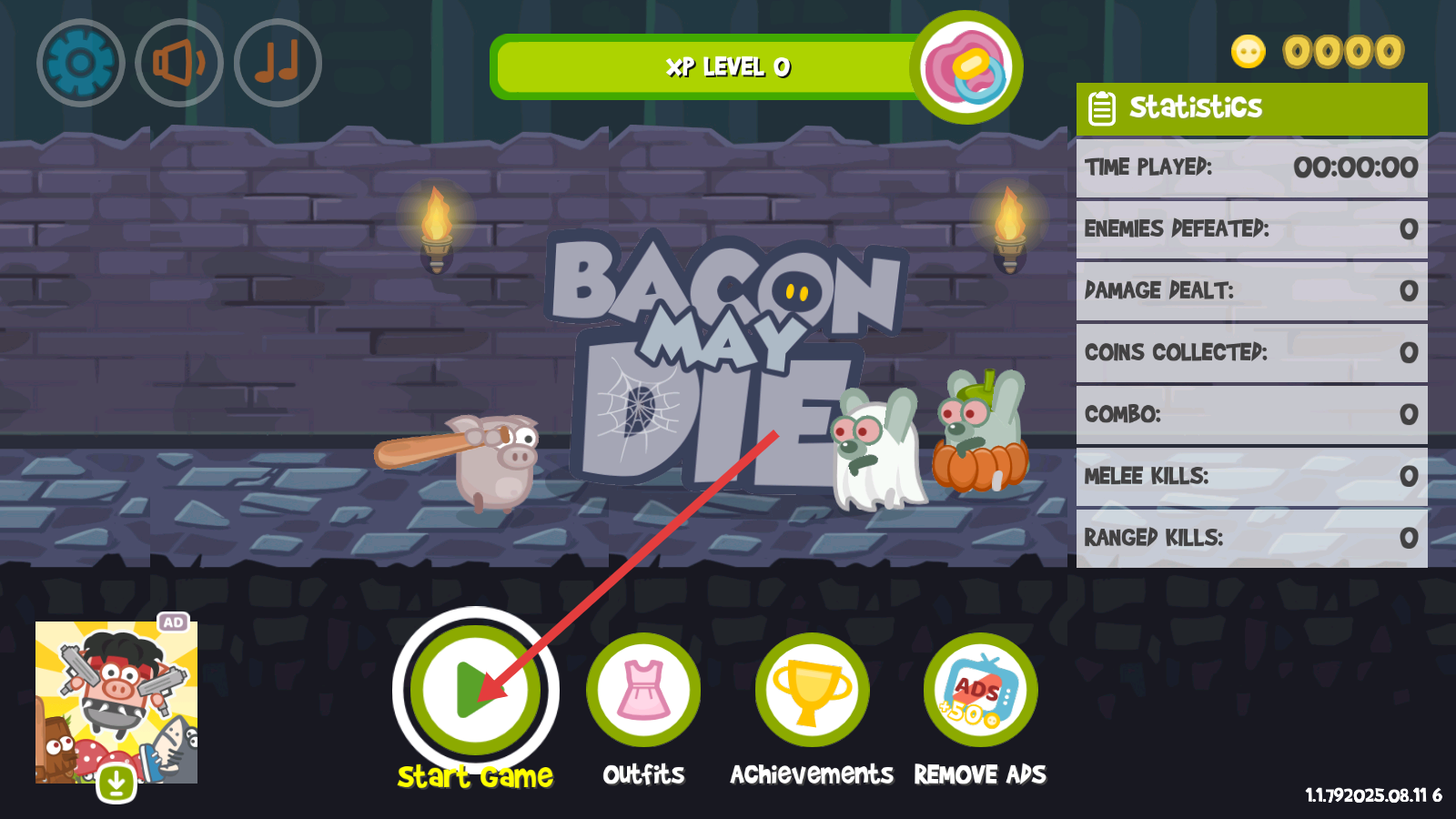 1、在【Bacon-May-Die】界面,点击【Start-Game】,开启战斗冒险,准备迎战怪物。