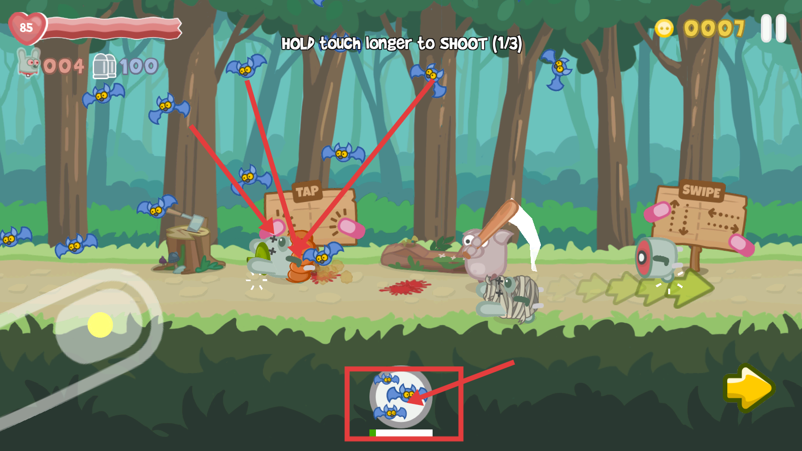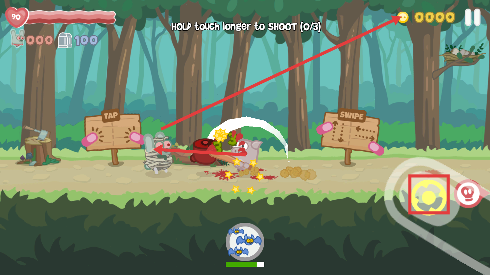 3、释放【蝙蝠】技能攻击敌人,完成【HOLD-touch-longer-to-SHOOT】任务,高效清敌。