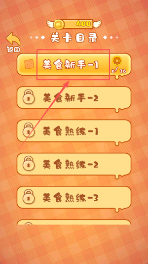 1、点击“点我开吃啦!”进入关卡目录,选择“美食新手-1”开始挑战。