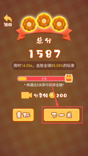 4、通关后查看成绩,若击败85%玩家,点击“下一关”继续挑战,累计通过5关即可领取宝箱奖励。