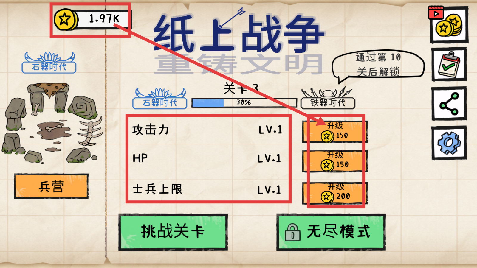 1、利用【1.97K】资源,升级【攻击力】【HP】【士兵上限】,提升战力后挑战关卡,为后续战斗奠基。