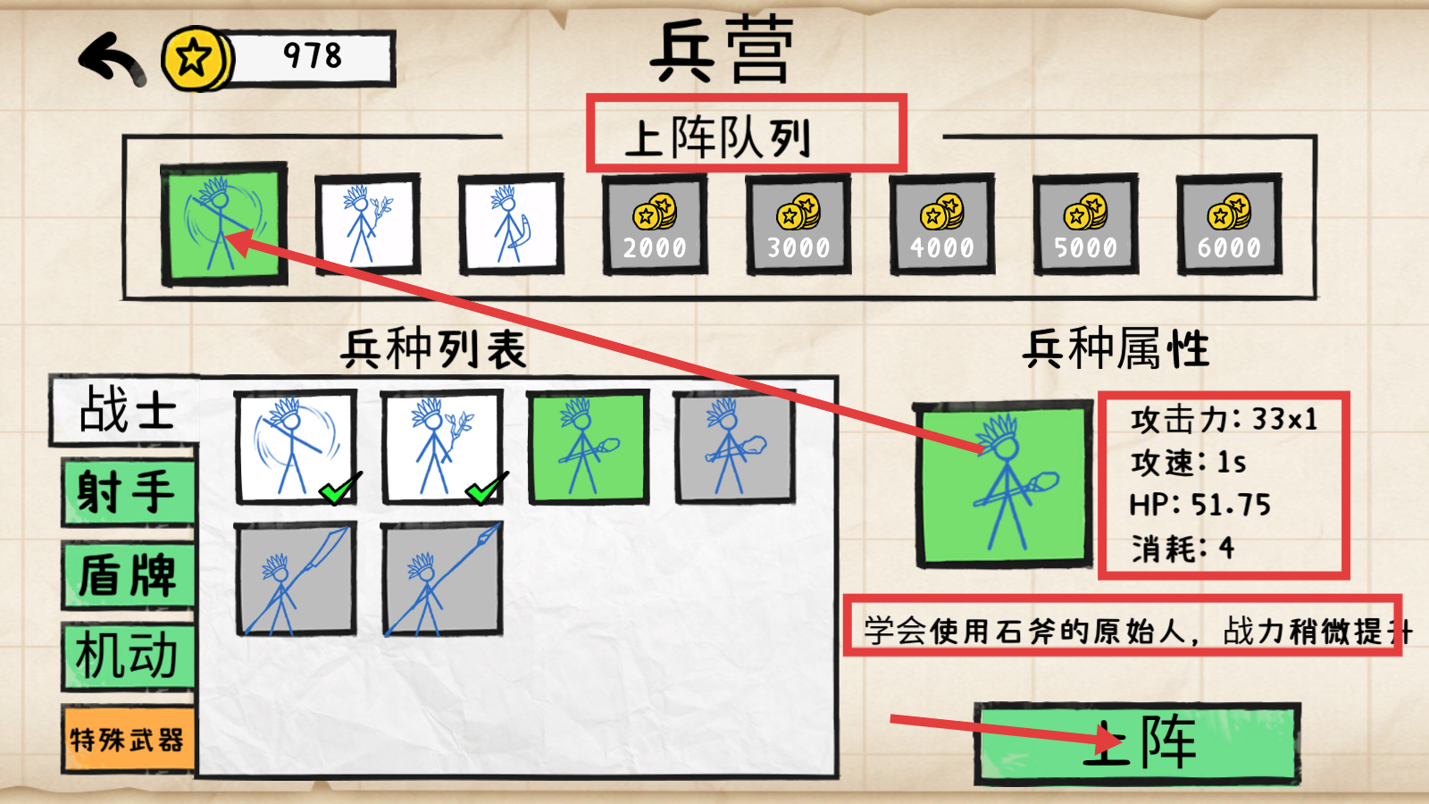 2、在兵营界面,选择兵种加入【上阵队列】,查看【攻击力-33x1】等属性,点击【上阵】,组建强力队伍。