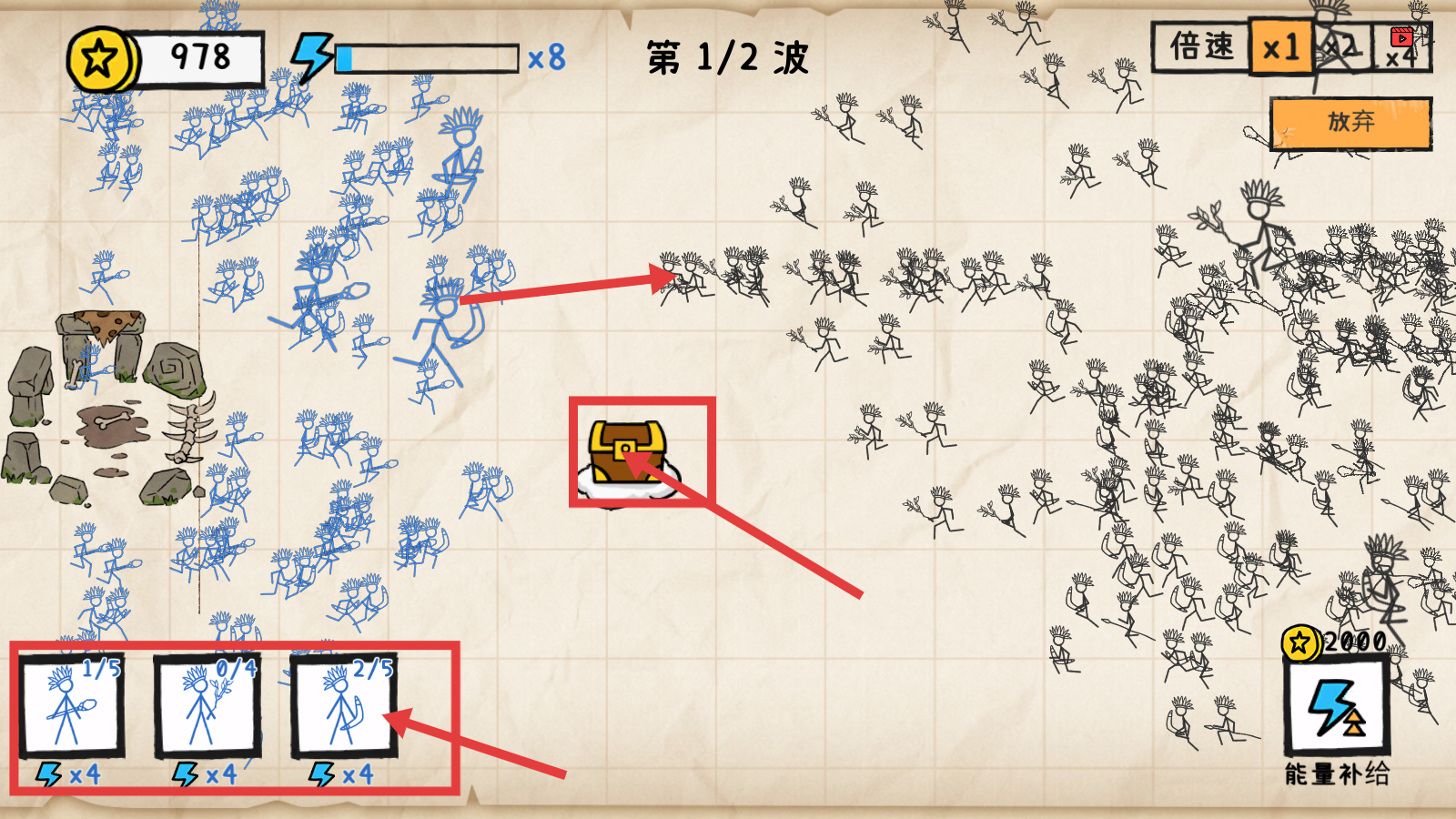 3、战斗时合理使用兵种,注意【能量】消耗,争夺宝箱资源,抵御第1/2波敌人,保障防线稳固。