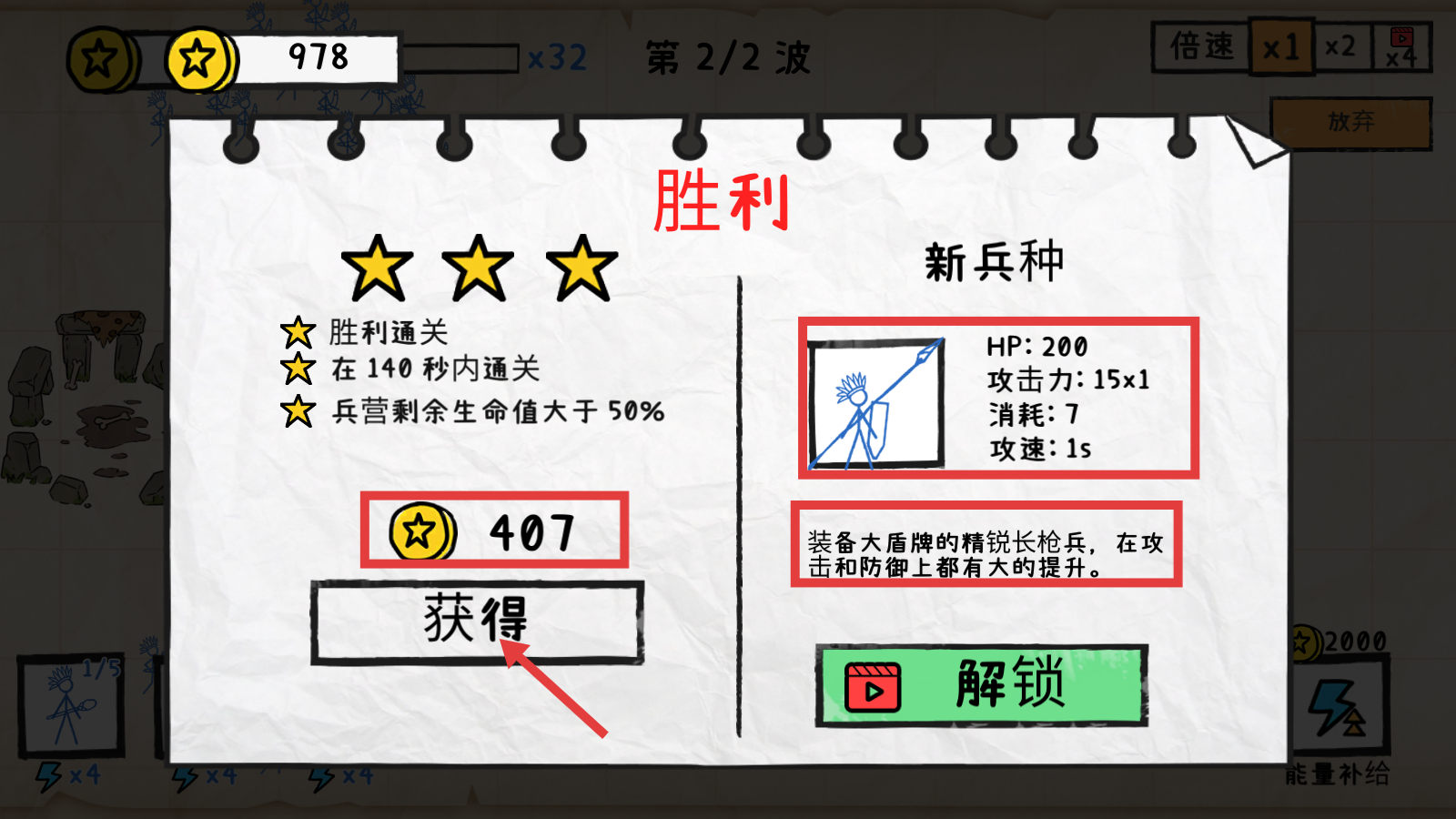 4、胜利通关后,领取【407】金币,解锁【HP-200】的新兵种,提升战力,为后续关卡做准备。