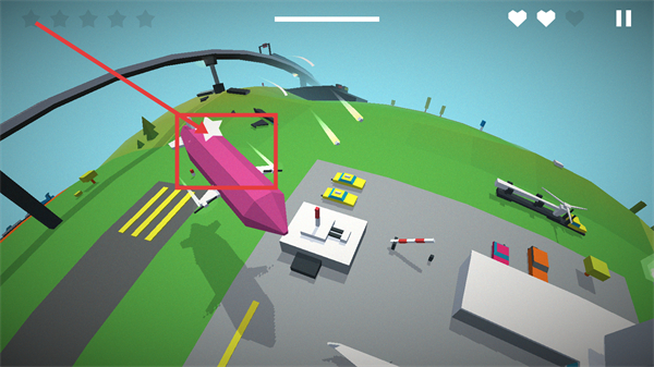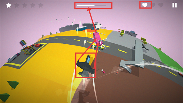 3、操控飞机时关注上方进度条和右上角生命值,避开障碍物,保持飞行稳定,推进游戏进程。