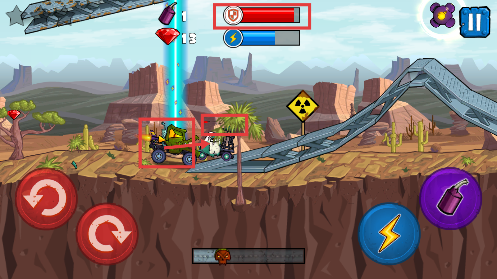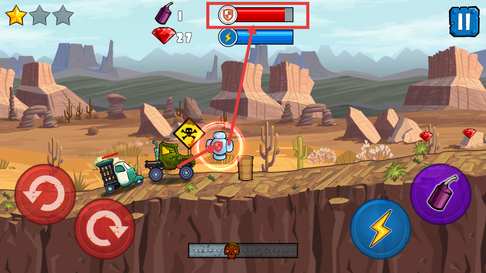 3、探索中收集【护盾-道具】,提升车辆防御能力,同时收集钻石资源用于升级。