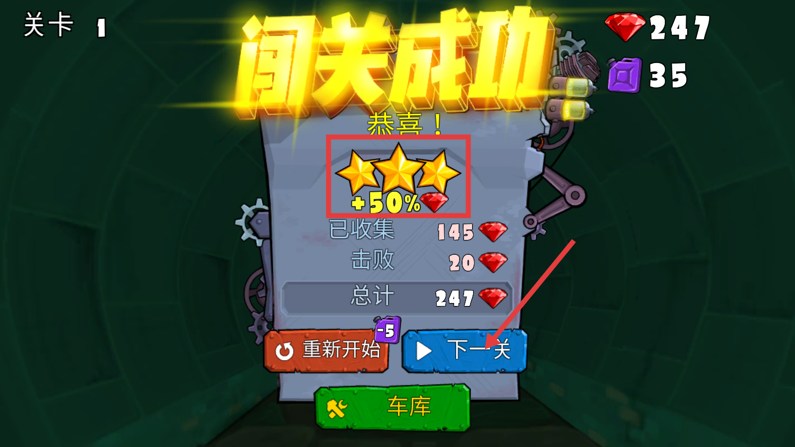 4、闯关成功后,获得【三星-+50%】钻石收益,点击【下一关】继续挑战,积累更多奖励。