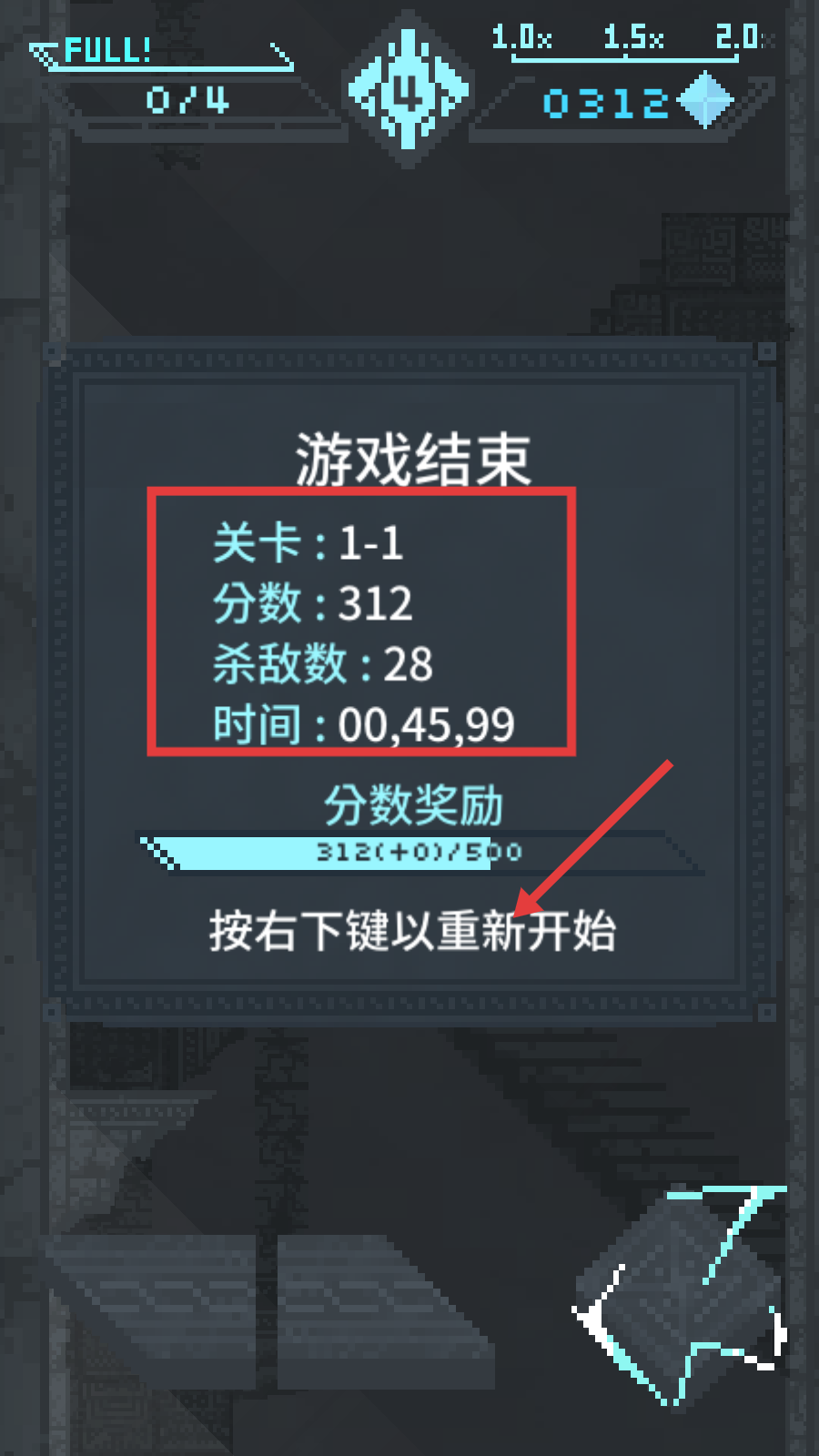 4、游戏结束后查看【关卡-1-1】等数据,按右下方键重新开始,挑战更高分数和杀敌数。