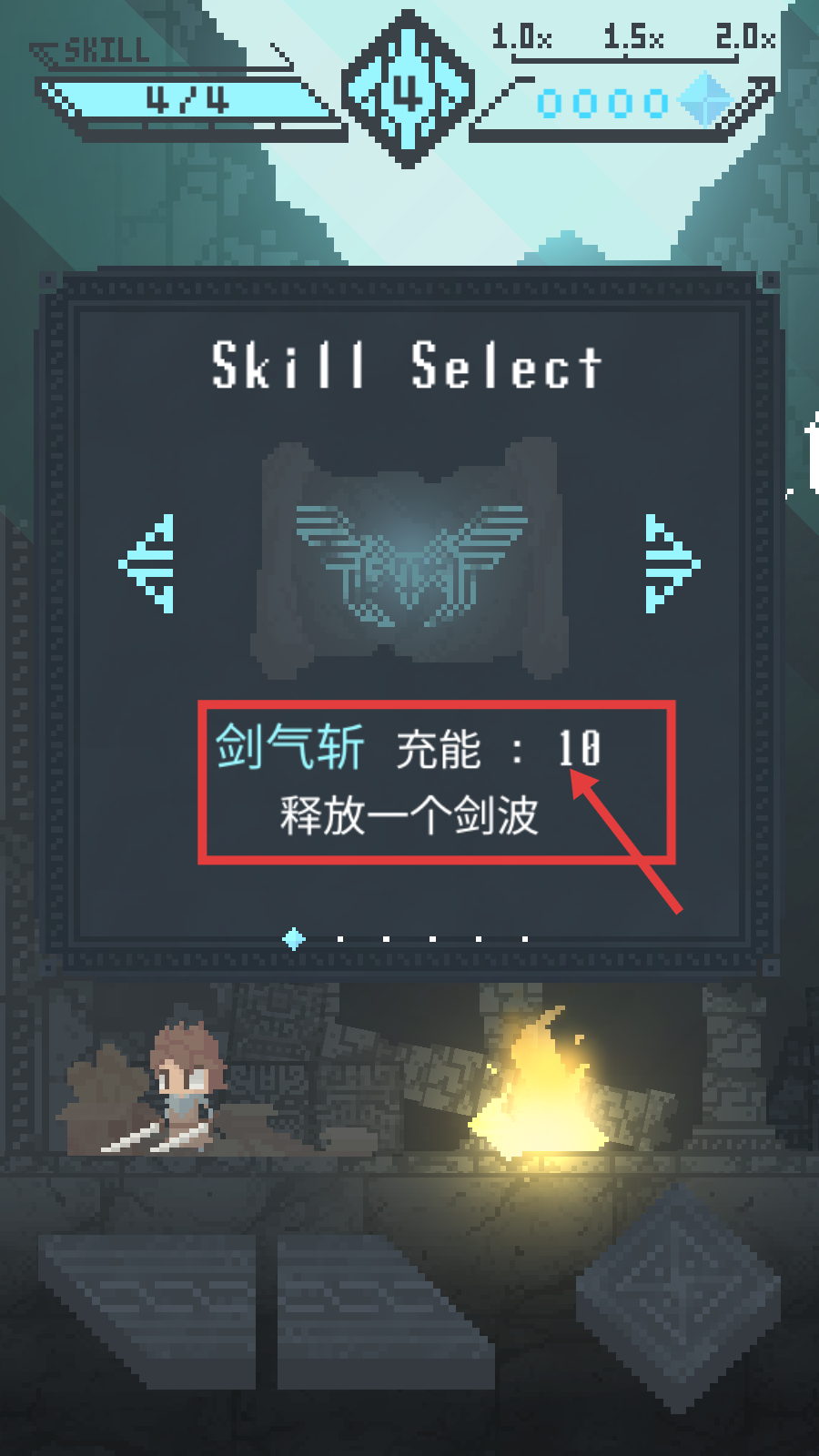 1、选择【剑气斩-充能:10-释放一个剑波】技能,战斗时可远程释放剑波,提升清敌效率。