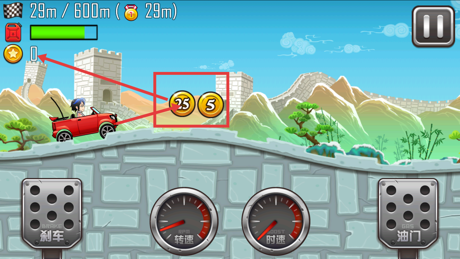 3、行驶过程中收集【25】【5】等金币,积累资源用于车辆升级,同时留意地形,防止车辆失控。