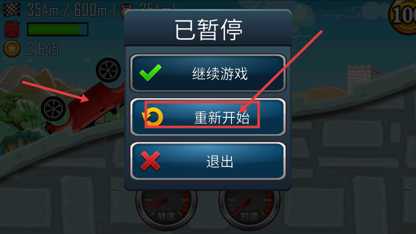 4、车辆翻车后,在暂停界面点击【重新开始】,可重启关卡,再次挑战以获取更高分数与金币。
