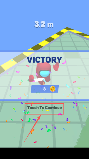 4、弹窗出现「3.2m VICTORY」,点「Touch To Continue」收下奖励并进入下一局。