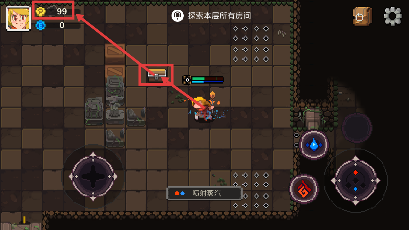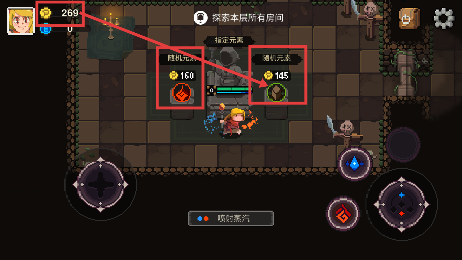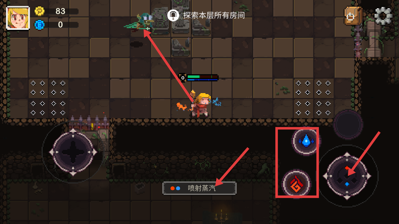 2、进入地牢后,以【探索本层所有房间】为目标,使用【喷射蒸汽】技能战斗,合理运用元素技能应对怪物。
