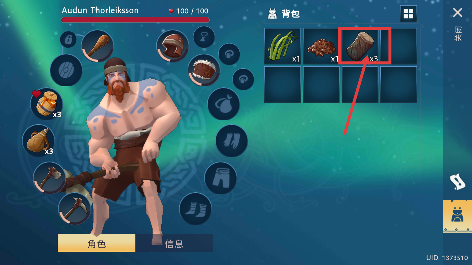 3、进入背包界面,查看采集到的资源(如木材),了解资源数量,为制造操作做准备。