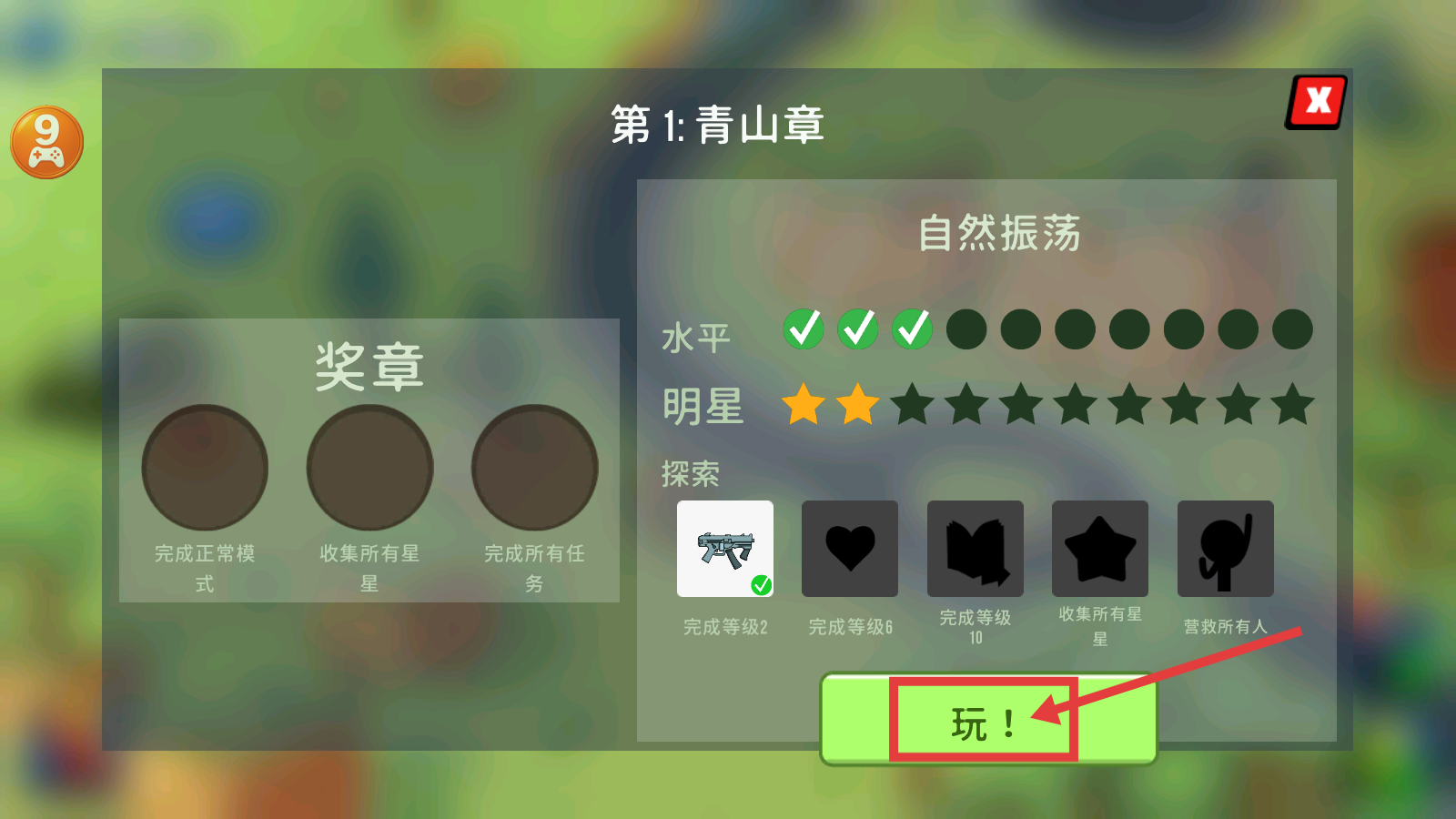1、点击【玩!】进入【第1:青山章】,关注水平、明星、探索各项进度,推进章节挑战。