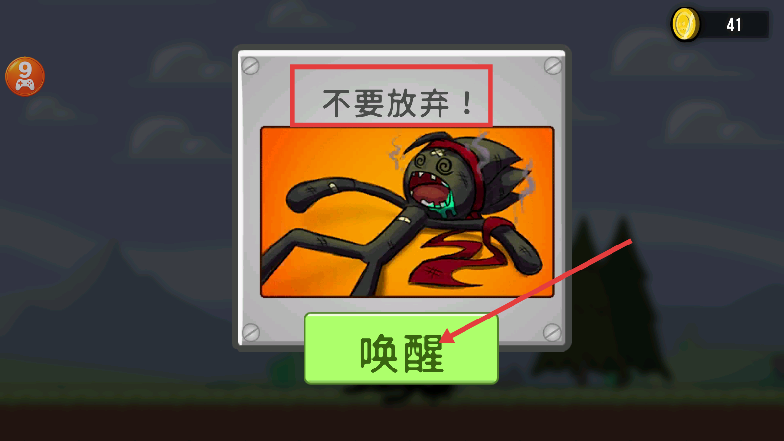 4、遇到失败时,点击【唤醒】按钮,响应【不要放弃!】提示,继续游戏,积累金币【41-枚】。