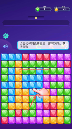 2、接着,观察棋盘,点击任意两个或以上相邻的同色星星进行消除并得分。