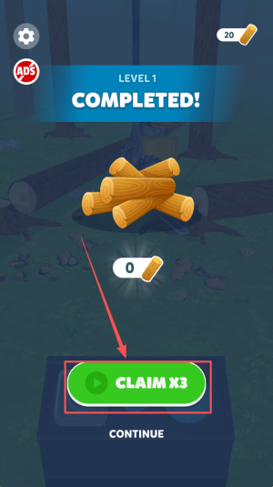 4、最后,当界面弹出“LEVEL 1 COMPLETED!”时,点击“CLAIM X3”领取三倍奖励,再点“CONTINUE”进入下一关。