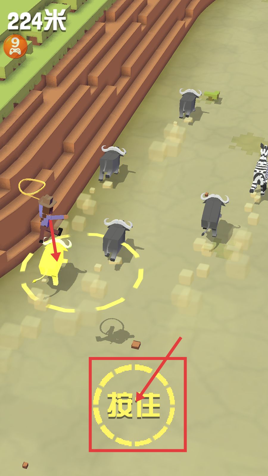 2、遇到目标动物时,点击【按住】按钮蓄力,保持操作以触发驯服机制,高效完成动物收服。