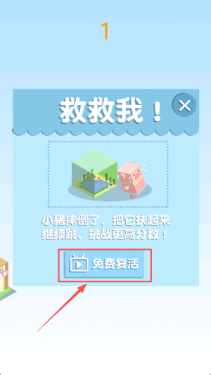 4、最后,若小猪摔倒,点击“免费复活”即可扶起小猪继续挑战更高分数。
