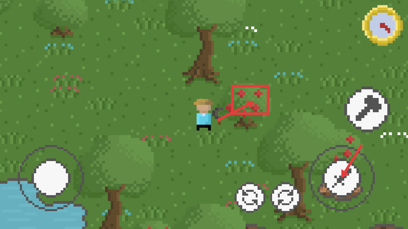 3、靠近资源点时,点击右侧【锤子】工具图标,让角色手持工具进行资源采集,积累农场发展物资。