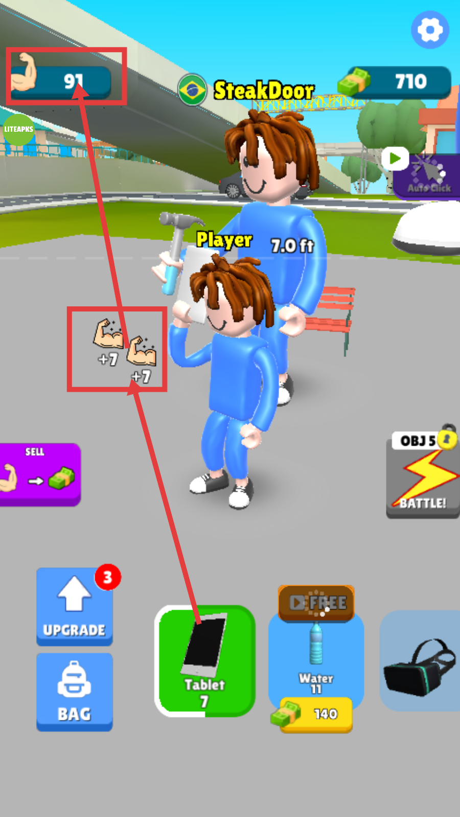 2、持续点击角色,关注【肌肉数值-91】和【+7-+7】的反馈,快速积累肌肉数值。