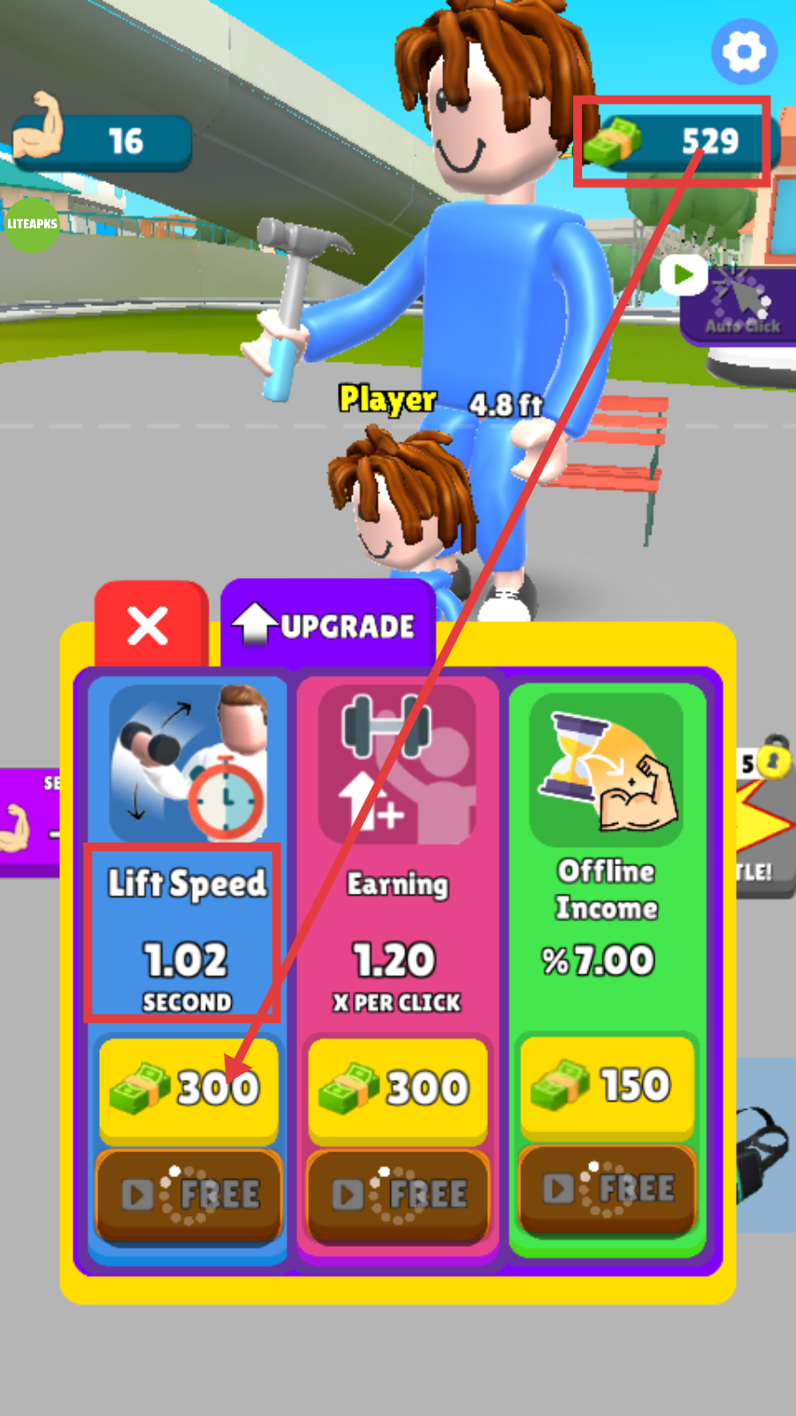 3、花费金币升级【Lift-Speed-1.02-SECOND】,提升锻炼效率,合理利用【529】金币资源。