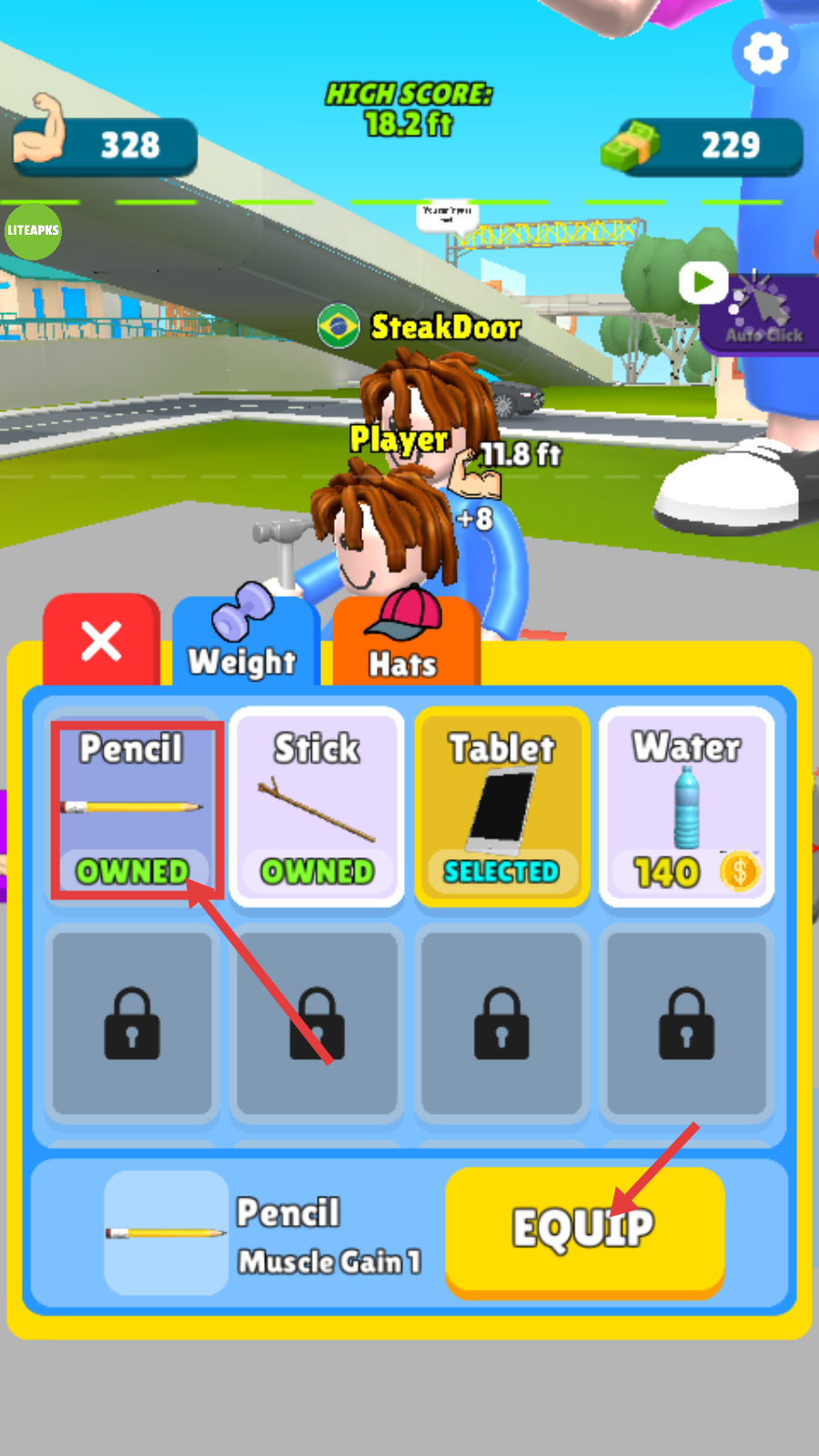 4、装备【Pencil-OWNED】,点击【EQUIP】,提升肌肉获取效率,助力角色成长。