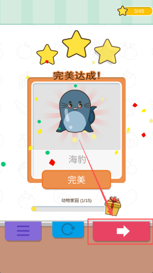 4、最后,当屏幕显示“完美达成!”且评分为3/45时,点击“下一关”继续挑战更高难度的动物家园拼图。