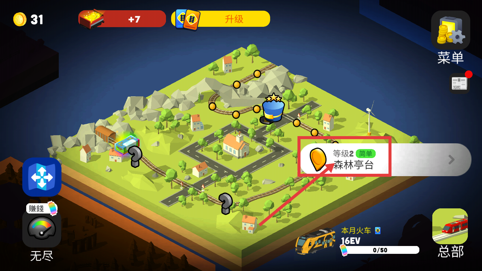1、点击【等级2-简单-森林亭台】进入关卡,开启火车运输乘客任务,可查看升级、菜单功能,熟悉界面后推进。