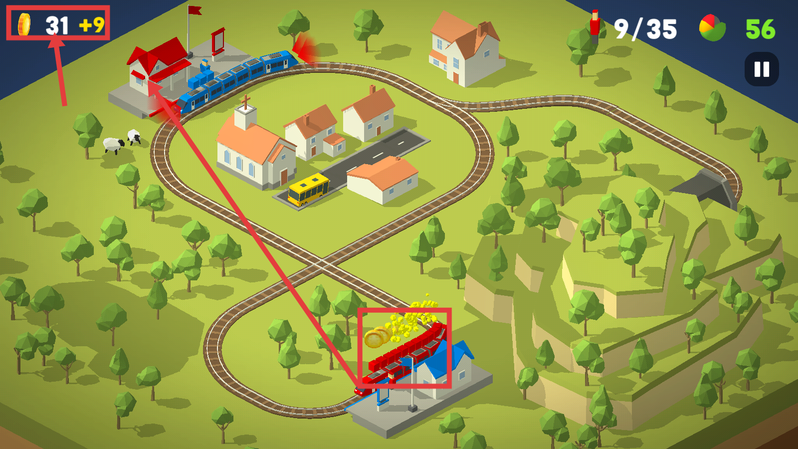 2、操控蓝色和红色火车,前往对应车站接送乘客,积累金币【31+9】,开始完成运输次数目标。