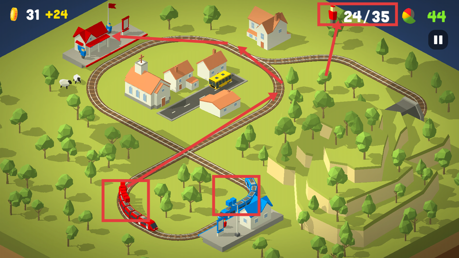 3、关注【24/35】乘客数量,调度红色和蓝色火车沿轨道行驶,持续运输乘客,推进关卡进度。