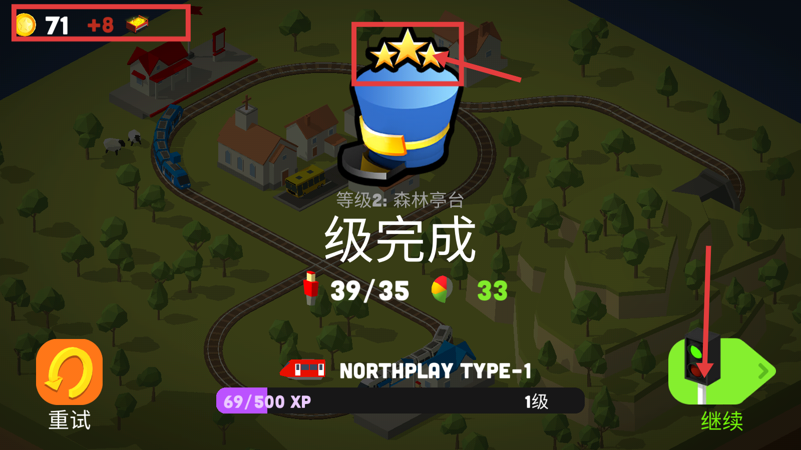 4、关卡完成后,获得【金币71+8】和三星评价,点击【继续】按钮进入下一关,积累资源用于升级火车。