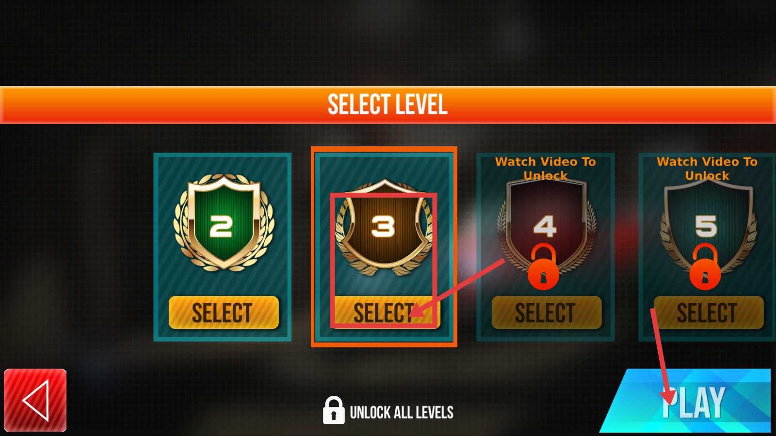 1、在【SELECT-LEVEL】界面点击【等级3】的【SELECT】按钮,再点击【PLAY】,开启机器人战斗关卡挑战。