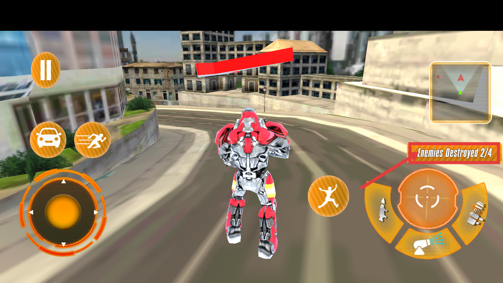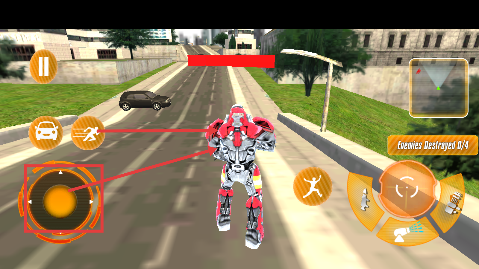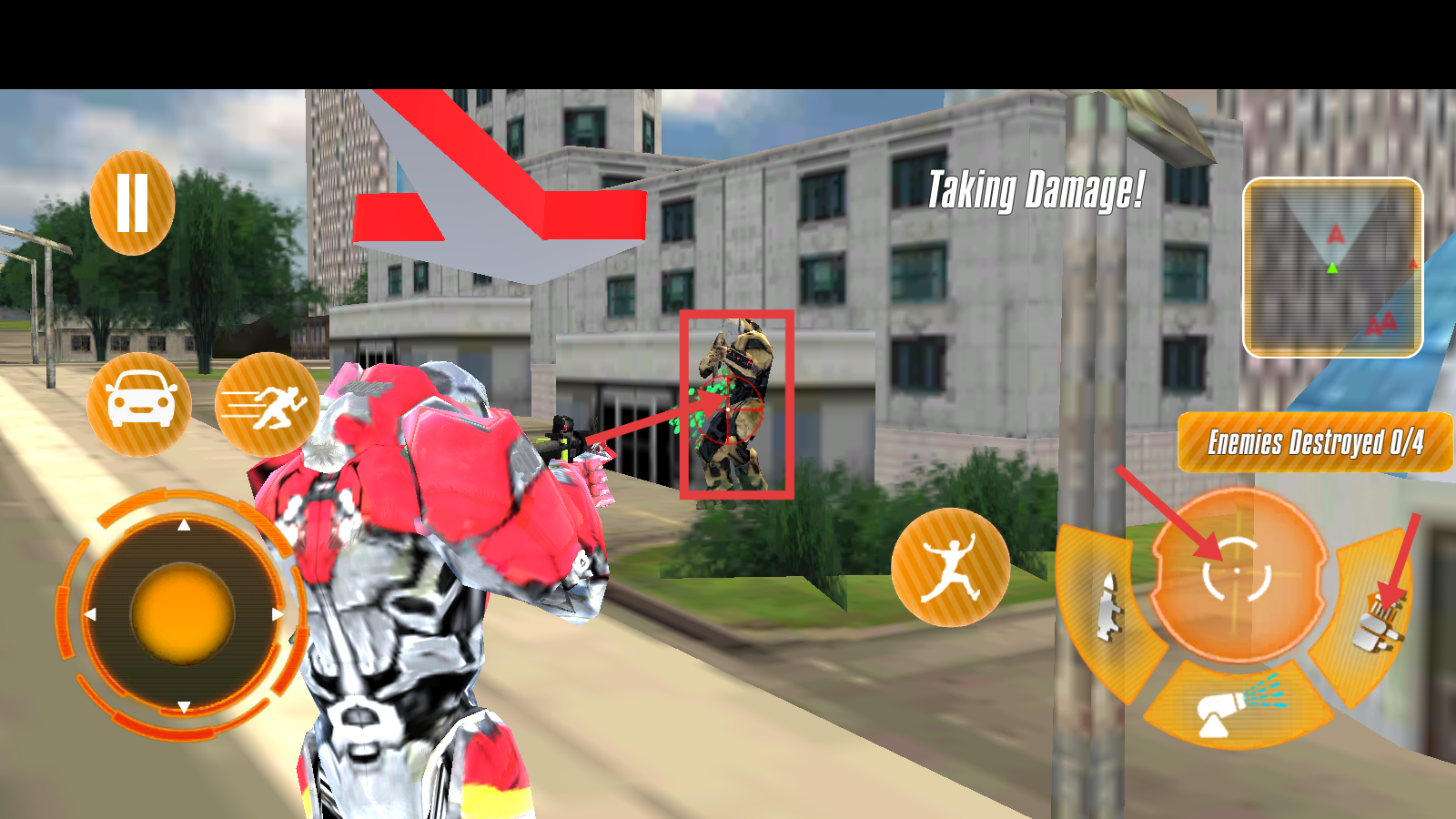 3、发现敌方机器人后,使用右侧攻击按钮发起攻击,关注【Enemies-Destroyed-0/4】杀敌进度,逐步消灭敌人。