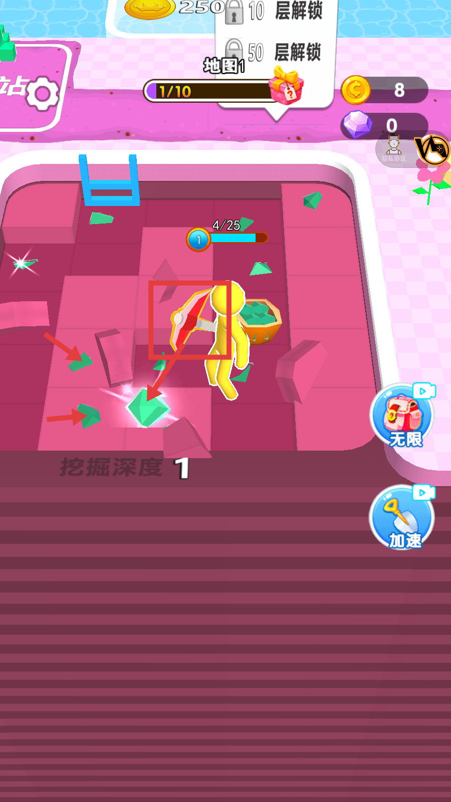 2、使用工具挖掘绿色钻石,提升挖掘进度,积累经验升级,逐步深入挖矿区域,获取更多矿石。
