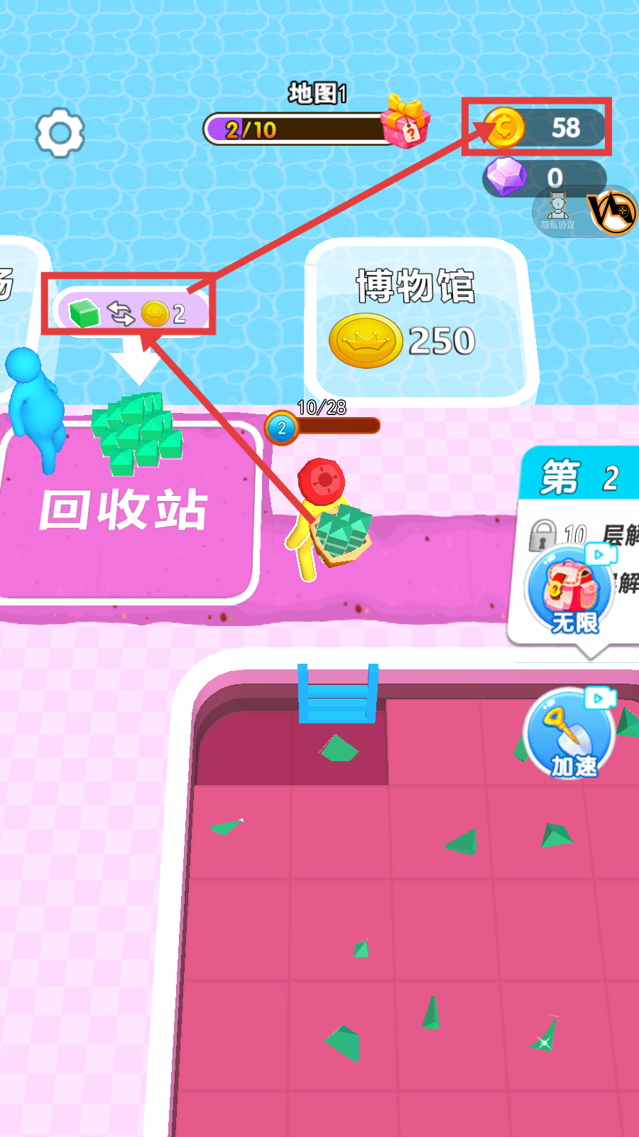 3、将矿石送到【回收站】,兑换金币,如【绿色方块-兑换2金币】,积累金币至【58】,提升资源储备。