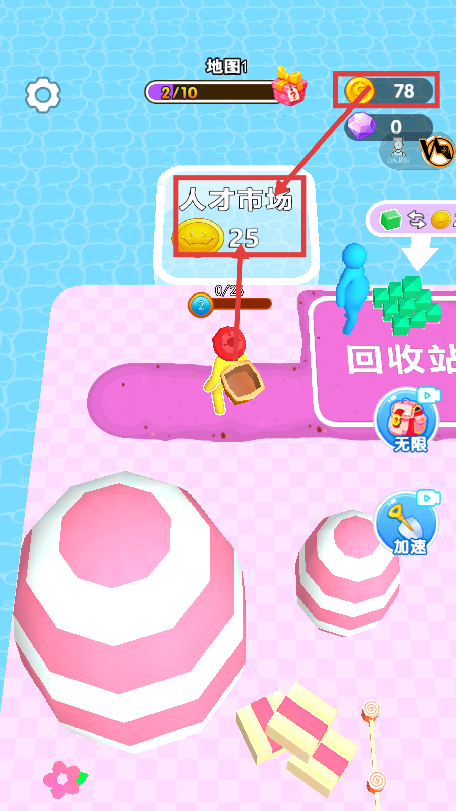 4、前往【人才市场】,花费【25】金币解锁功能,积累金币至【78】,推进游戏进度,解锁新区域。