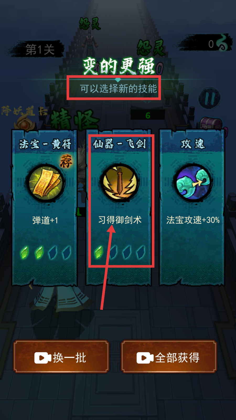 2、战斗中出现技能选择时,优先选择【仙器-飞剑】,也可根据需求选择法宝黄符、攻速(法宝攻速+30%)等,获取新技能增强战力。