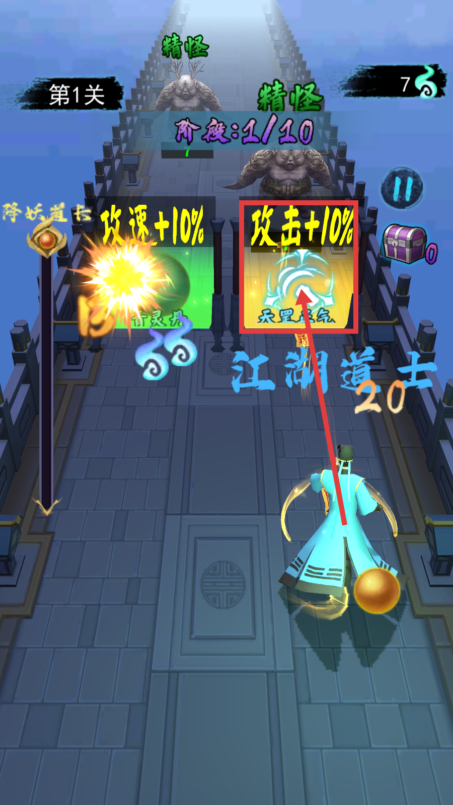 1、进入【第1关】,点击【开始挑战】,操控茅山道士开启降妖之旅,初始攻击5、血量20,界面的七日签到、每日祈福等功能可辅助成长。