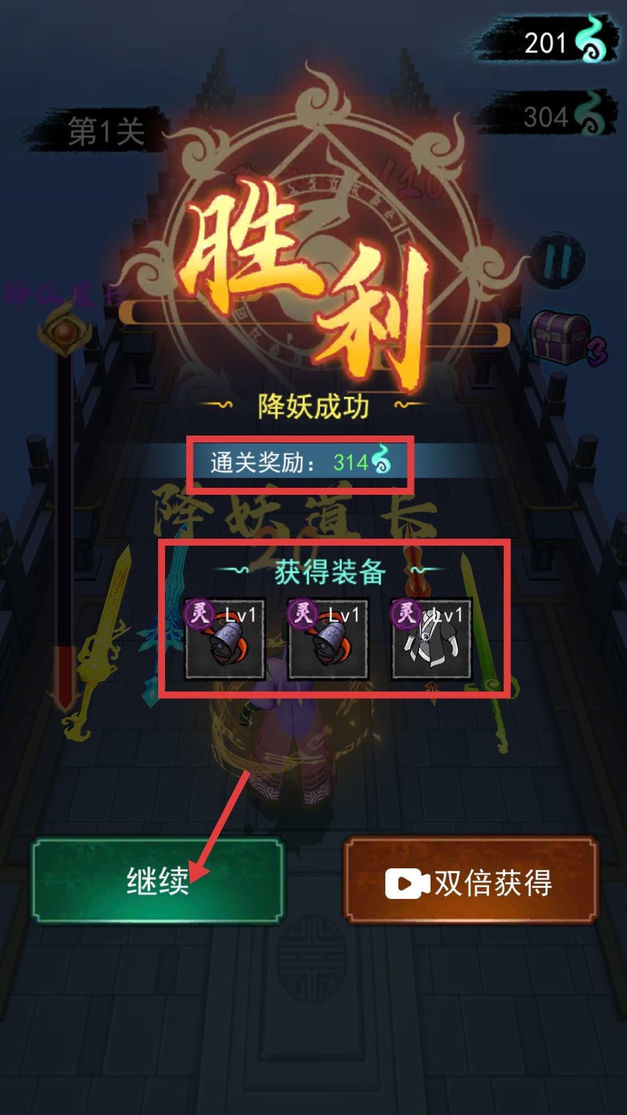 4、通关后领取【314】资源和灵级装备,点击【继续】按钮开启下一场降妖挑战,积累资源强化装备。