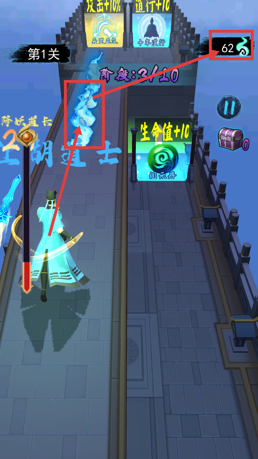 3、在关卡中注意收集蓝色资源,积累资源的同时可选择【生命值+10】的buff提升生存能力。