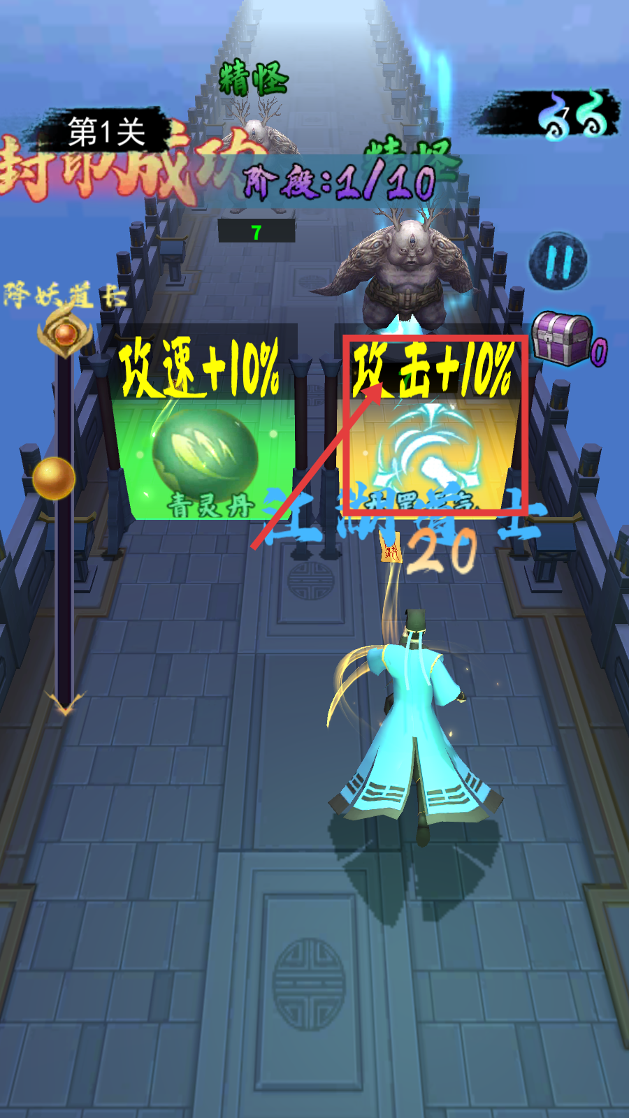 2、在第1关战斗中,优先选择【攻击+10%】的buff,增强对精怪的伤害,推进阶段进度。