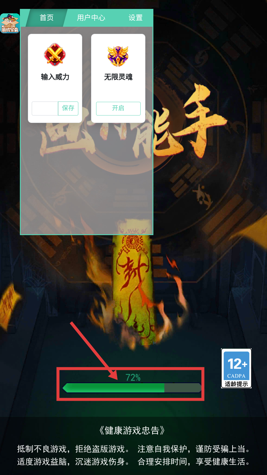 1、关注加载进度,可在用户中心设置【输入威力】并保存,开启【无限灵魂】功能,注意12+-CADPA适龄提示。
