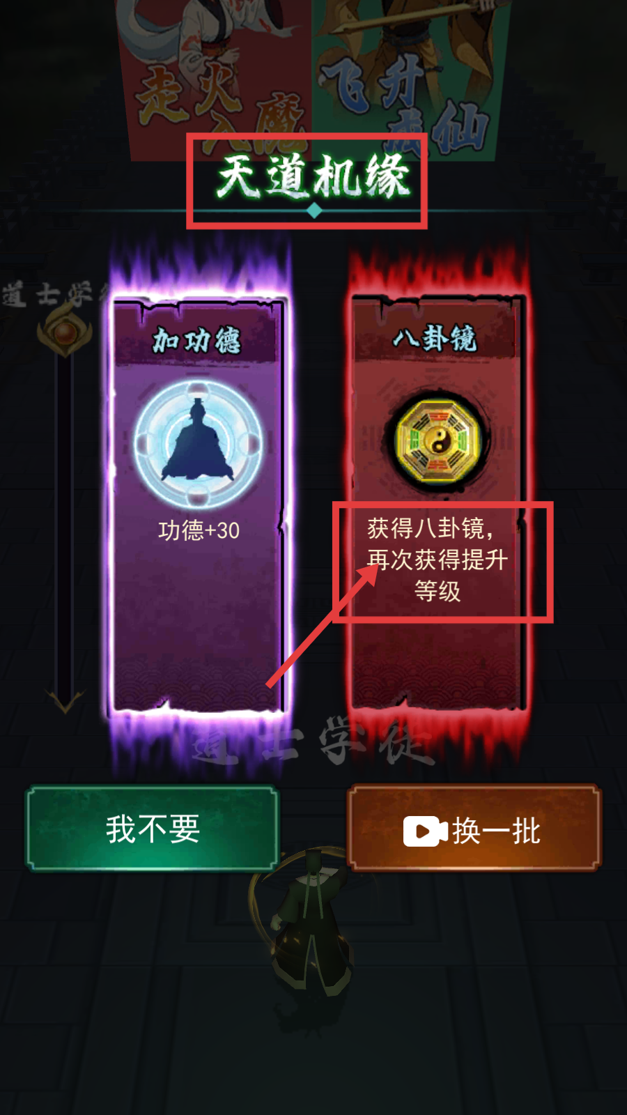 2、遇到【天道机缘】选择时,优先选【八卦镜】,可提升等级增强战力,助力降妖。