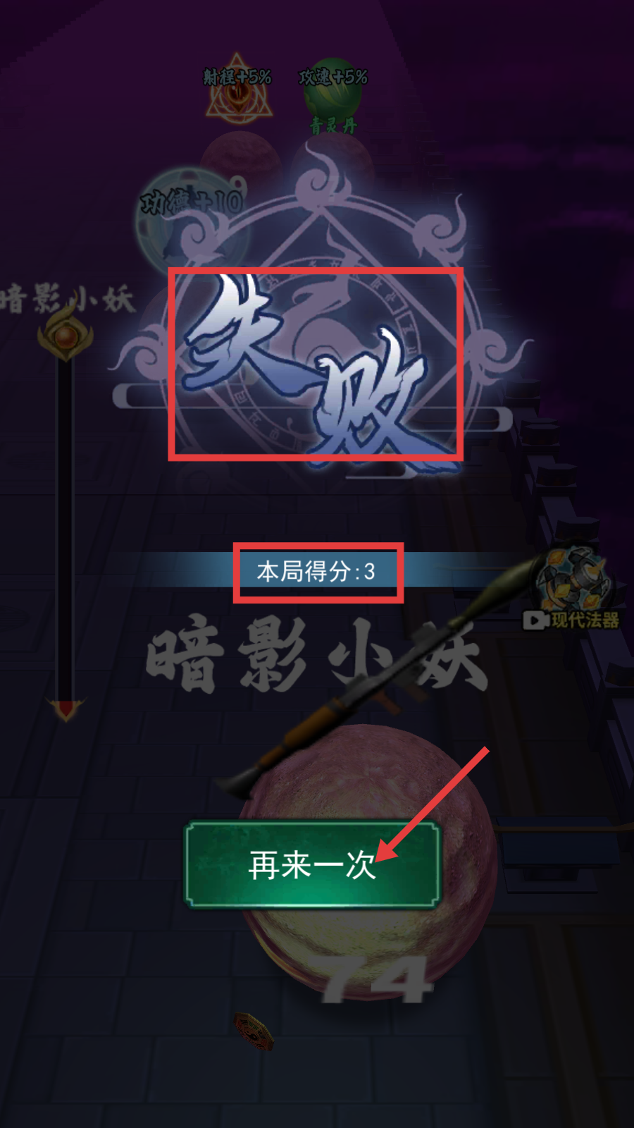 4、若出现【失败】界面,本局得分3时点击【再来一次】重新挑战,积累经验提升战力争取更高得分。