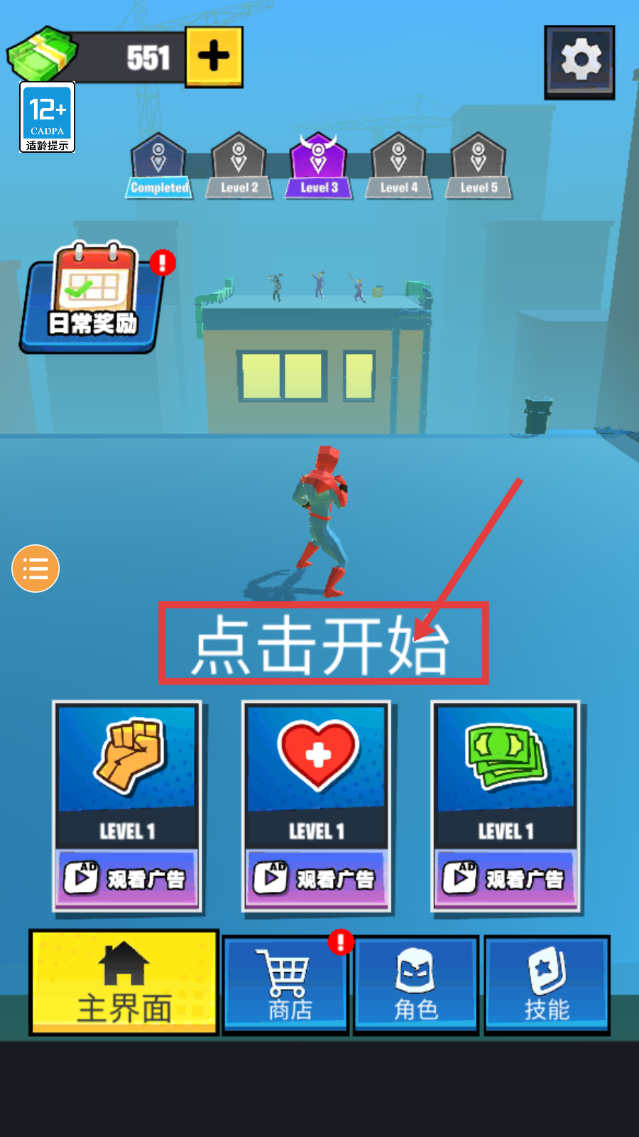 1、注意12+-CADPA适龄提示,点击【点击开始】进入关卡,记得领取【日常奖励】获取资源。