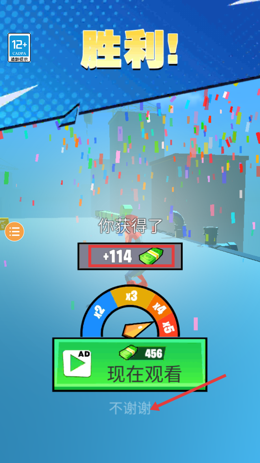4、通关后获得+114钞票,若不想观看广告可点击【不谢谢】,继续下一关积累更多资源。